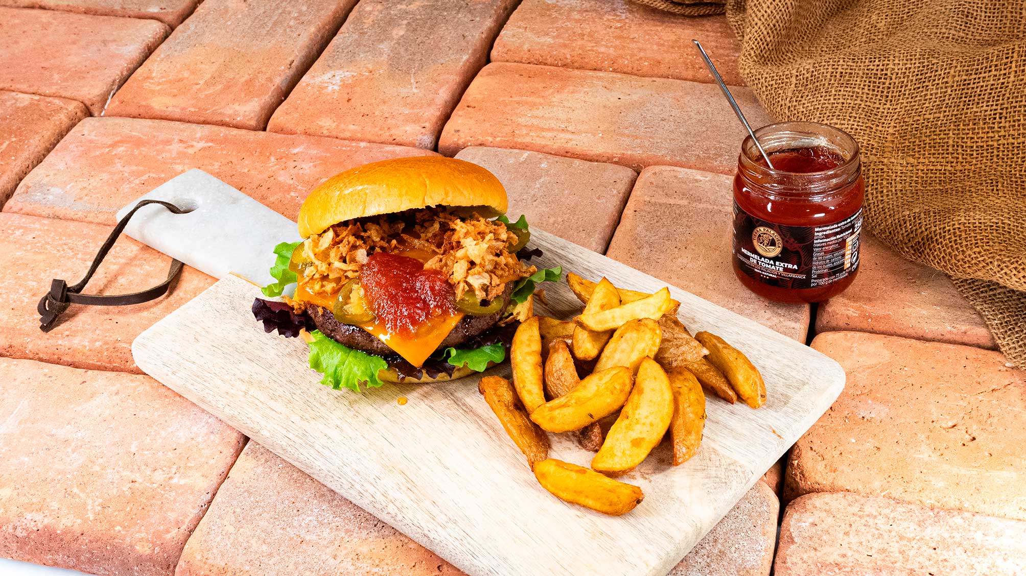 - Slice the buns open and place the lettuce on the base. Add the hot burger and top with the cheddar slice, allowing it to melt from the heat.Add 3–4 slices of jalapeño and the crispy fried onion. Finish with a generous tablespoon of Tierra Palaciega red tomato jam and close the bun.