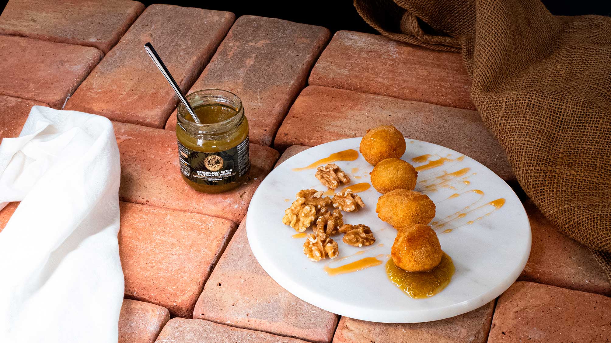 - Serve the croquettes on a base of green tomato jam, add some nuts, and drizzle with fine threads of the Oloroso reduction.